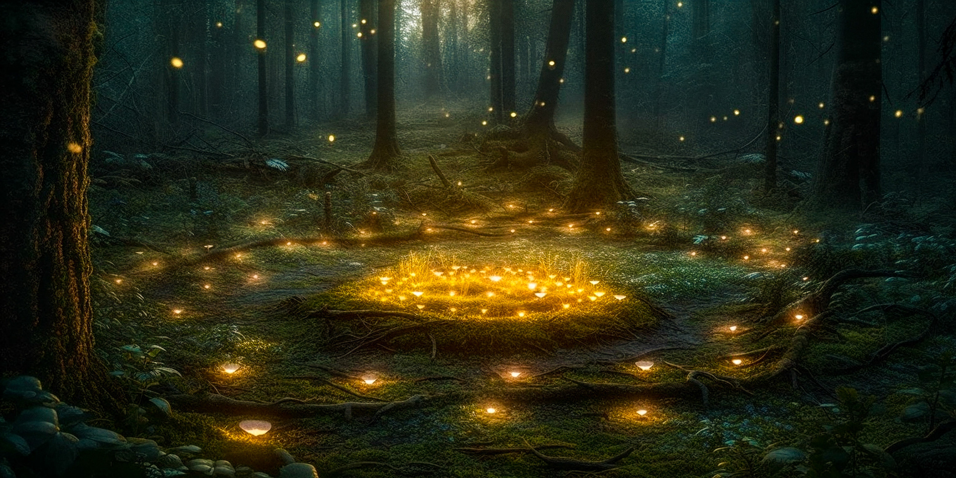 My goal was to make something enchanting and magical and different from the smooth and fluid AI-created art I've been doing lately. I'm really happy with the result - the fairy roads in particular have a magical realism, Richard Dadd kind of feel. I like the crunchy textures and the warm saturated lights. Created in midjourney with keywords like 'cinematic, hyper-realistic, depth of field, illuminated, enchanted'. Upscaled 5x using the "Super Zoom" neural filter in photoshop (with enhance details on, sharpen at 5, no noise reduction) which created a lot of the artifacts and rough edges you would see in real photographs at such low light levels. Found a set of lightroom adjustments (exposure, color temp, clarity, dehazing, grain) that felt good, and batch applied so they seem like they could go together.